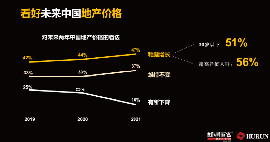同时,他们看好国内地产价格:47%的高净值人群认为未来两年国内地产价格将稳健增长,较去年增加3个百分点,37%认为将维持不变,16%认为将有所下降,较去年减少7个百分点。