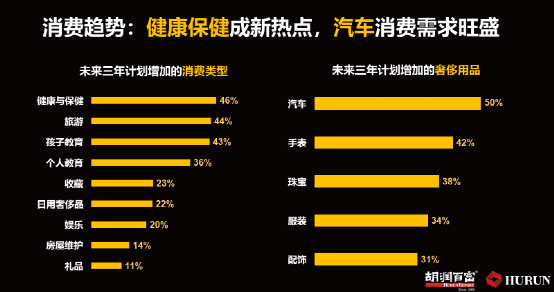 消费新趋势:健康保健持续升温,汽车消费需求旺盛。未来三年计划增加的消费:健康与保健(46%)、旅游(44%)和孩子教育(43%)是中国高净值人群未来三年计划增加的前三大消费类型。未来三年购物计划:汽车(50%计划购买),手表(42%),珠宝(38%),服饰(34%),配饰(31%)。