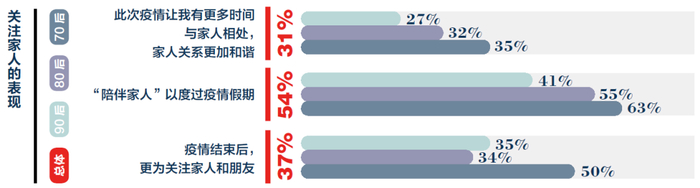 相比年轻一代的90后、80后高净值人群,此次疫情映射出70后高净值人群更加重视家人/朋友的亲密关系。35%的70后高净值人群认为疫情让自己“有更多时间与家人相处,家人关系更加和谐”、“陪伴家人”(63%)是自己度过疫情假期的主要方式且疫情结束后自己要“更为关注家人和朋友”(50%)。