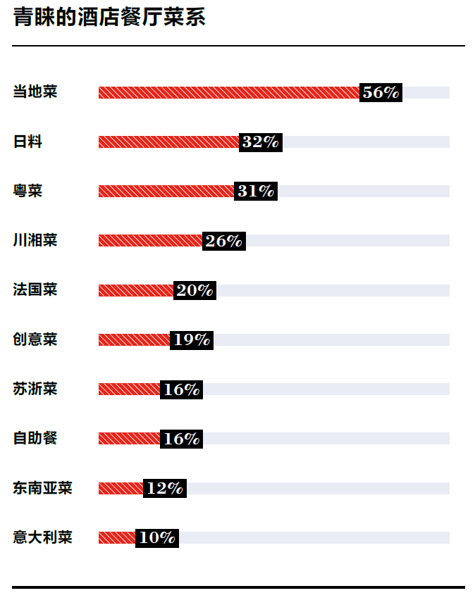 餐饮作为旅游中人们缓解饥饿并稍作休憩的环节一直是中国高端旅游者非常重视的一个方面。当地菜以56%的选择率成为中国高端旅游者最青睐的酒店餐厅菜系。日料和粤菜以32% 和31%紧随其后。其他著名的菜系如法国菜,意大利菜和川菜都进入了前十。