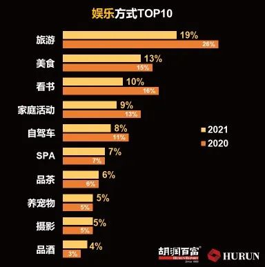 旅游依然是高净值人群最青睐的娱乐方式,但热度下降7个百分点;美食超过看书,排在第二;其次是家庭活动和自驾。
