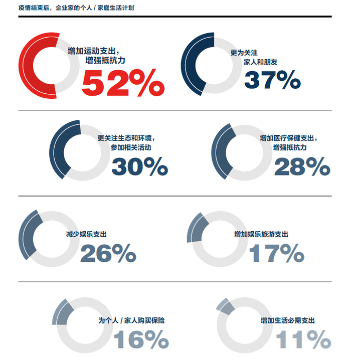 健康管理将会是疫后高净值人群家庭生活的重中之重。超过半数高净值人群计划“增加运动支出”,约三成计划“增加医疗保健支出”,16%的企业家计划“为个人/家人购买保险”。