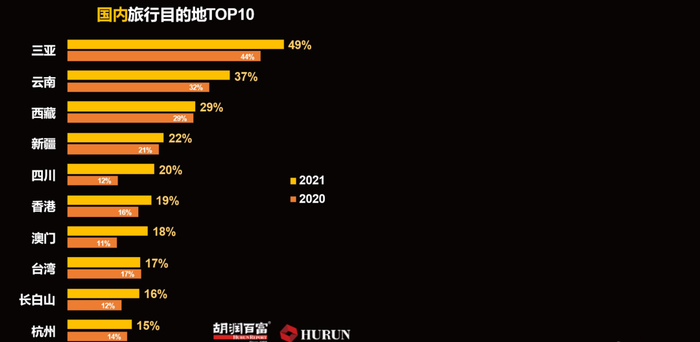 国内旅游目的地:三亚、云南、西藏和新疆为高净值人群最青睐的国内旅游目的地前四名。其中,三亚连续九年领跑最青睐国内旅游目的地。2020年三亚凭借自贸港建设、离岛免税等政策红利,在后疫情时代的旅游业复苏和旅游经济增长等方面为全国乃至全球的旅游目的地树立了标杆。