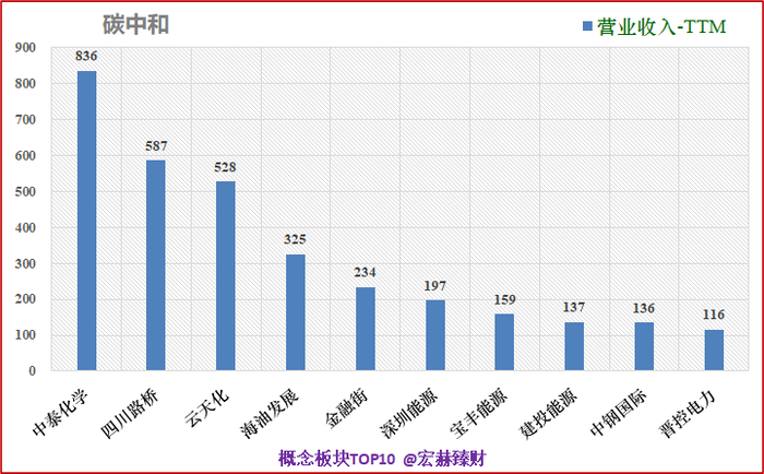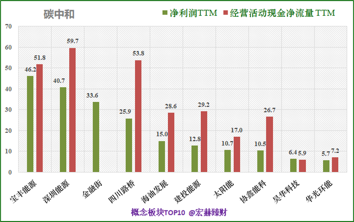 目前A股涉及“碳中和”概念的上市公司共有70家,部分财务指标前十如下: