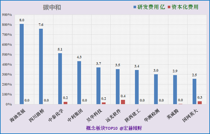 当前“碳中和”概念涉及公司研发费用前三:海油发展8.0亿、四川路桥7.6亿、中泰化学5.1亿。
