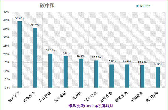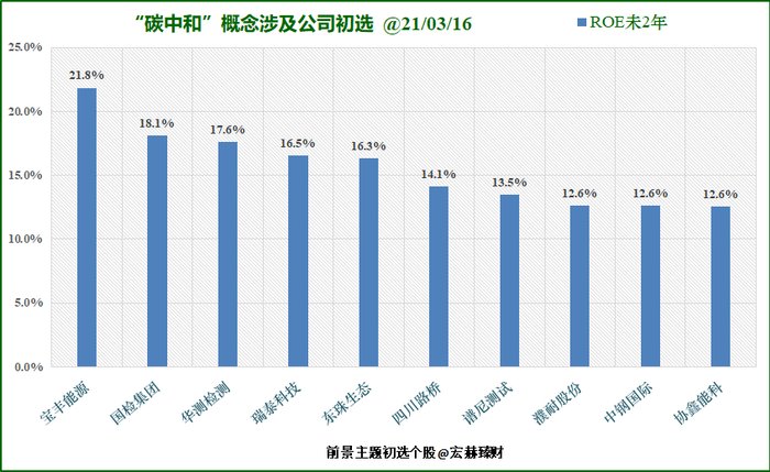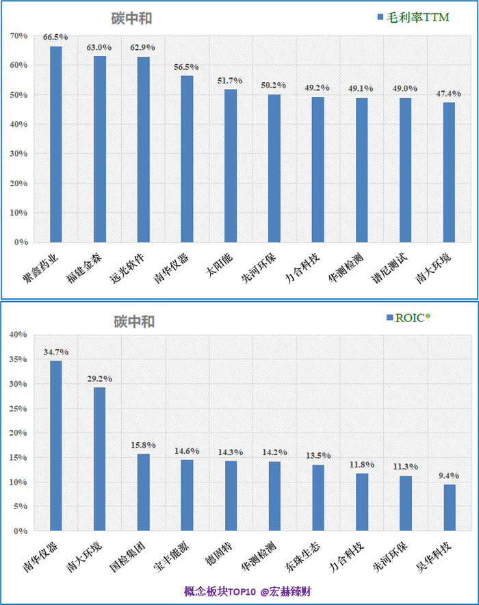 宏赫臻财根据行业特性,在70家“碳中和”概念涉及上市公司中,取此ROE、ROIC两指标均值大于10%的公司按照盈利能力排序如下,共计【7】家。(同时剔除了指标异常值)