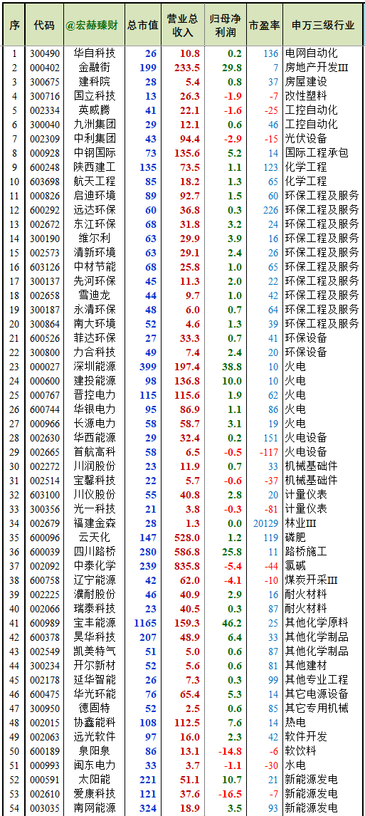 说明:排序按照宏赫臻财原创之关注系数排名,建议优先研究关注系数为5以上的个股,但此系数不构成投资建议。且不一定是越大越好。整体上看,5分以下居多说明该细分行业整体偏高估,资本市场喜欢给予溢价,5分以上居多,说明该细分行业整体偏低估,资本市场往往给予溢价性不强。(建议优先关注次序:①5-10分·标粉色;②2.5-5分·标绿色;③10-20分·标蓝色;④其他,回避两头极端值)