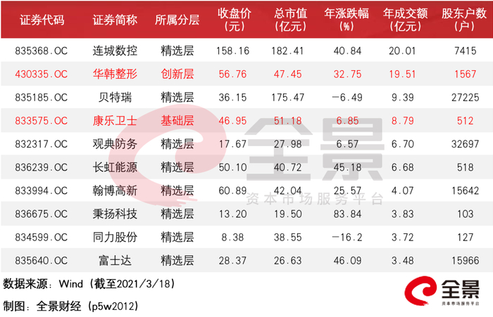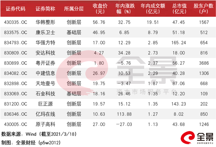 Wind数据显示,截至3月18日盘后,10只新三板个股总市值突破100亿元,另有36只新三板股票年内成交额累计超1亿元。