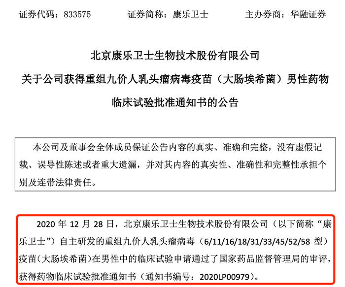 2020年年底,康乐卫士公告称,公司获得重组九价人乳头瘤病毒疫苗男性药物临床实验批准通知书。