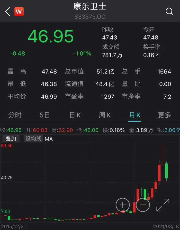 在投资者追捧之下,今年以来,康乐卫士的股价不断创下新高,最高盘中涨至80.5元/股,截至最新,报46.95元/股,最新总市值51.18亿元。
