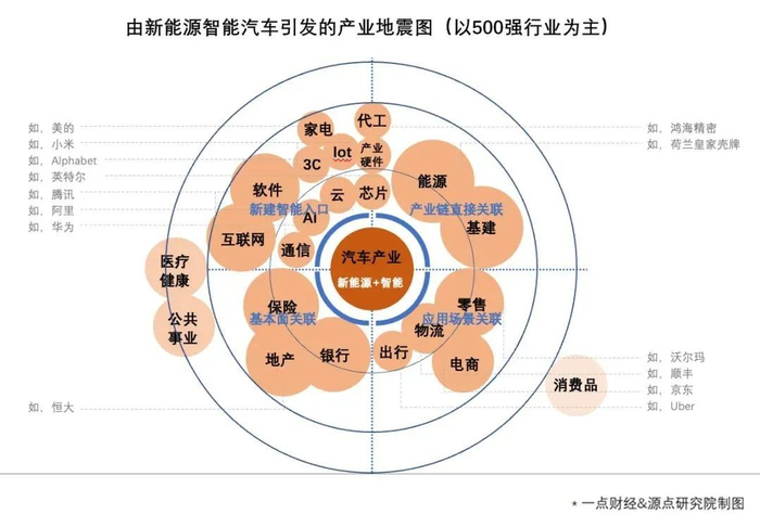值得关注的是,新能源智能汽车“结构性机会”,也带来了波及甚广的产业地震。分析发现,那些新能源智能汽车的跨界巨头,都分布在“产业地震图”中。也就是说巨头们下场,不止为了“争机会”,更是为了“守天下”。