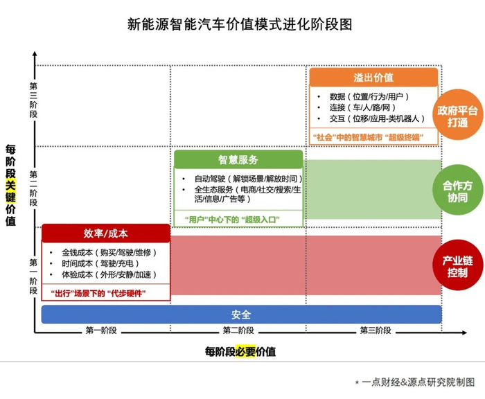 如上图所示,新能源智能汽车的价值模式存在三个阶段的进化。每个阶段其带给用户的关键价值不同,故企业“卡位姿势”也不同。