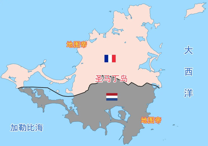 法国占圣马丁岛北部,面积约53平方千米,荷兰占圣马丁岛南部,面积约34平方公里。