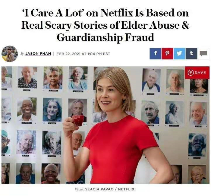 这是 Netflix 2020 的新电影,叫做《I care a lot》,讲述了在美国,一个女人串通法官,医生,护士,鉴定中心,甚至精神病院,不择手段地获得孤寡老人们的监护权,之后再变卖他们的房产存款,她的生意就是把老人像韭菜一样收割。影片里的各个角色只是各类集团的符号化身,整个利益网大到连黑道都退避三舍。