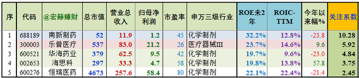 ROIC前三:恒瑞医药23.2%、华东医药20.4%、罗欣药业20.2%。