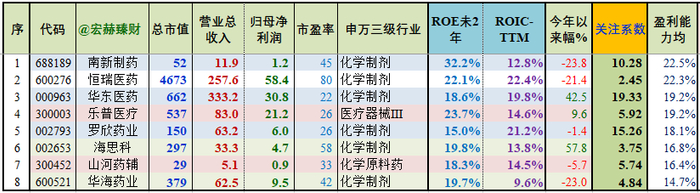 ROE前三:华东医药22.1%、恒瑞医药21.6%、南新制药19.5%。