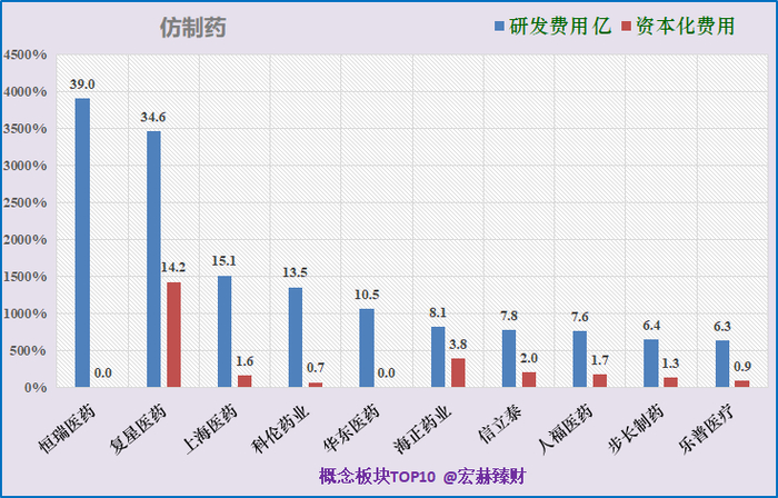 当前“仿制药”概念涉及公司研发费用前三:恒瑞医药39.0亿、复星医药34.6亿、上海医药15.1亿。
