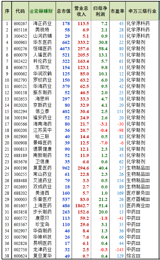 恒瑞医药4673亿;复星医药962亿;华东医药662亿。