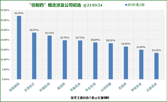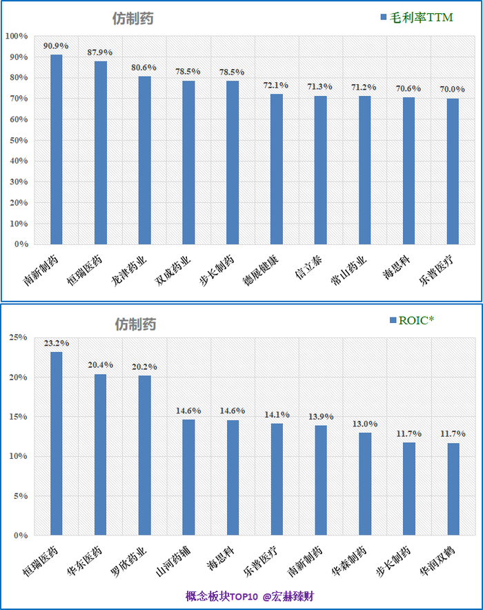 宏赫臻财根据行业特性,在38家“仿制药”概念涉及上市公司中,取此ROE、ROIC两指标均值大于12%的公司按照盈利能力排序如下,共计【8】家。(同时剔除了指标异常值)