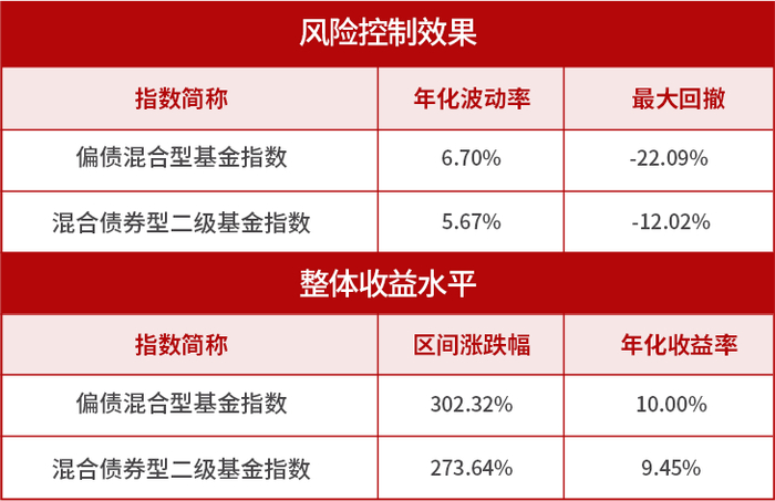 从整体收益水平来看,偏债混合型基金指数、二级债基指数的近15年区间涨幅分别为302.32%、273.64%,对比来看,偏债混合型基金的整体收益弹性更高一些。