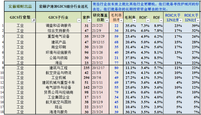 已完成巡礼的“工业”行业组18个子行业之盈利能力呈现
