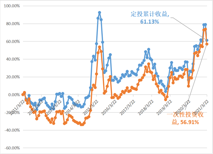 以沪深300指数为模拟月定投对象,测算近十年来(2011年3月22日至2021年3月22日)的累计回报,定投累计收益、一次性投资回报分别为61.13%、56.91%。从下图可知,在漫长的时间里股市穿越牛熊,而定投获取的回报长期优于一次性投资(蓝线始终走在橘线之上);且在市场大幅回调时,定投所经历的最大亏损要小于一次性投资。