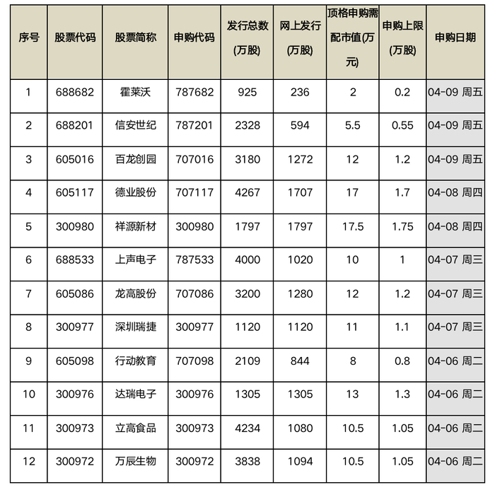 根据新股发行安排,下周A股将有12只新股申购。