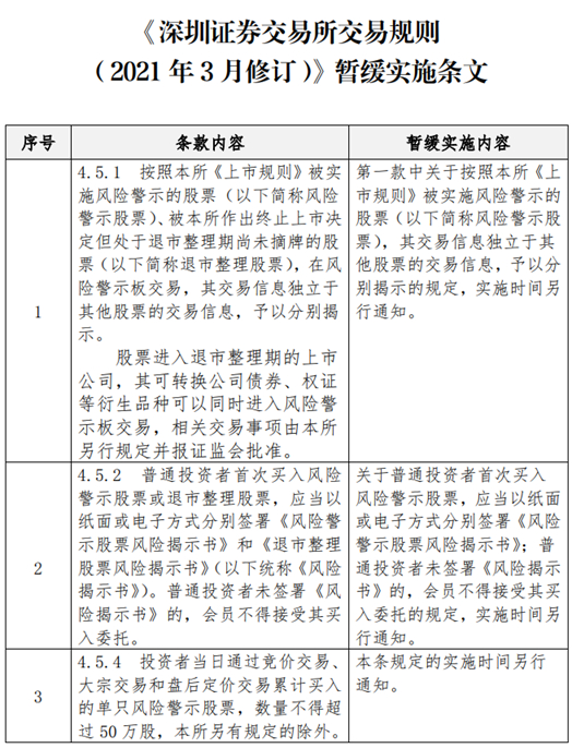 考虑到市场及会员业务技术准备情况,《深圳证券交易所交易规则(2021年3月修订)》中此前暂未实施的部分内容继续暂缓实施,具体实施时间由深交所另行通知。