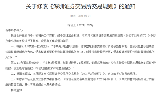 根据通知,深交所现发布《深圳证券交易所交易规则(2021年3月修订)》,自2021年4月6日起施行。