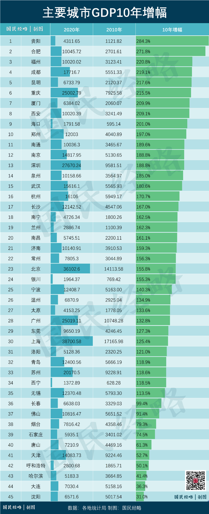 过去10年,贵阳、合肥、福州、成都、昆明GDP增速跻身5强。