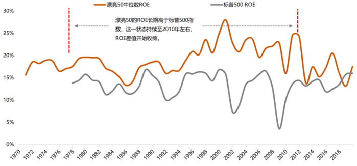 参考美国上世纪80年代,石油危机过后,美国经济周期进入了一个很长的“大缓和”阶段——通胀温和、盈利增长、利率逐步递降,也就是我们前文所提到的权益投资的第二理想的阶段,伴随着股市,尤其是核心资产的长期上涨。从1970年1月到2020年6月,美股“漂亮50”累计上涨了207倍,其中自上世纪80年代开始,近30年间只有4个年头跑输指数。核心原因是在经济增速放缓阶段,“漂亮50”成分股长期优异的盈利增长以及较强的盈利确定性。
