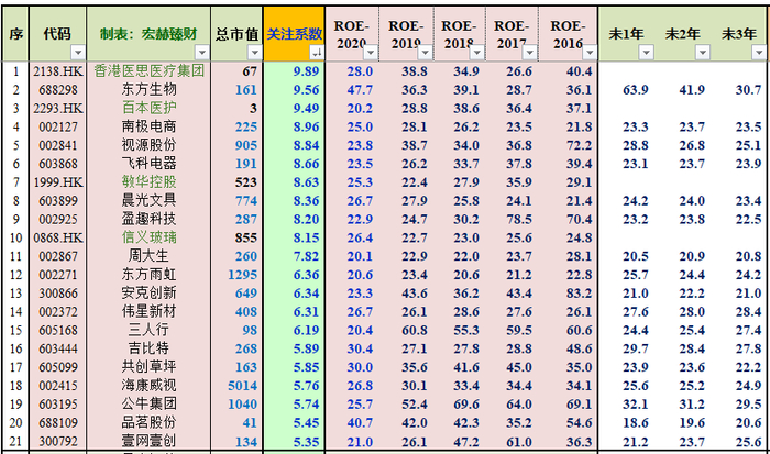 1、先看看2019-2020年机构持续抱团的核心资产的ROE