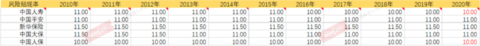 下表为2010年以来五大保险公司的风险贴现率。数据来看,中国平安、新华保险以及中国太保采纳11%,中国人寿以及中国人保为10%。从内含价值的数学意义出发,风险贴现率越高,相对来说更为保守,计算出来的新业务价值以及内含价值相对低一些;而风险贴现率低,结果通常相反。