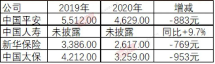 从代理人月均保费看,形势不容乐观。寿险公司月人均绩效普遍下降,唯一的例外是中国人寿,见下表。其中,中国平安代理人月人均保费下降883元,超过16%;新华保险以及中国太保下降超过20%,中国人寿小幅上升。另,中国人寿并未披露月人均保费收入具体数据,仅披露2020年月均有效销售人力同比增长9.7%。