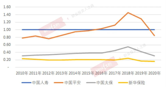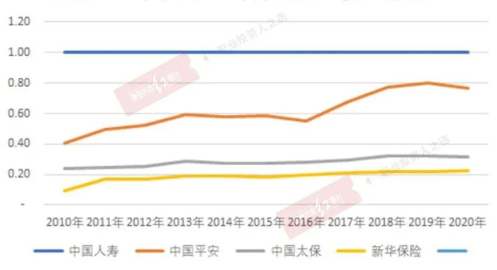 上述比较,难以形象比较各家保险公司地位的变动。如果将中国人寿的内含价值作为比较基础,视为1,用其他保险公司的内含价值与其做比较,不难发现,竞争对手都在挖角中国人寿。中国平安(寿险)与中国人寿的内含价值比率,从2010年的0.41,上升至2020年末的0.77,反映双方竞争差距逐步缩小,新华保险也从2010年的0.09上升到2020年的0.22。