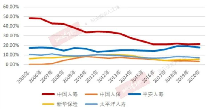 剩下另外两家保险公司,新华保险以及太平洋人寿(中国太保),市场份额有起有落,但是总体也相对维持稳定。