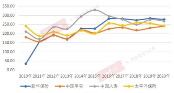 依然采取前述内含价值的相对比较法,将中国人寿作为比较基础,其他保险公司与中国人寿进行比较,结果如下图所示。至少从新业务价值的趋势角度看,中国平安超越中国人寿,可能只是个时间问题,时间点依赖于中国平安改革的进程。今年财报公布后,中国平安联席首席执行官陈心颖在回答媒体提问时,也并不讳言转型期间的困难, “这次深化改革,是30多年来做过的最广、最复杂、最深的改革,难度比我们想象的还要难。”