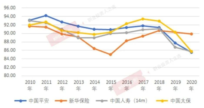 过去十年,寿险公司13个月保单继续率总体处于下行趋势。从2020年看,13个月保单继续率,新华保险>中国人寿(14个月)=中国太保>中国平安。