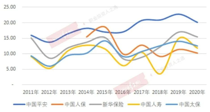 除去中国平安,其余四家总体ROE波动均不算小,尤其是中国人寿波动更为明显,就过去十年的数据来看,中国人寿ROE年度数据标准差3.61%,是五家保险公司中波动率最大的。