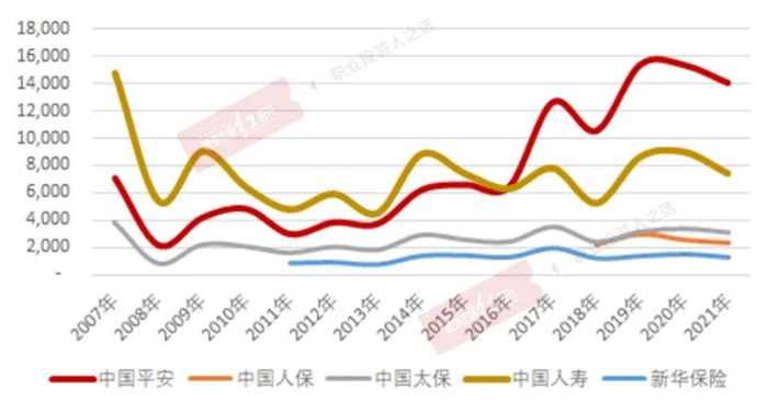 相比2007年,中国平安的总市值翻了一倍,从2007年底的7065亿元上升至1.4万亿;中国人寿的总市值从2007年的1.49万亿下降至7500亿元,市值的跌落幅度与市场份额恰好匹配;中国太保的市值总体稳定,新华保险的总市值相比上市之初的2012年增长56%,反映产品结构的变化。