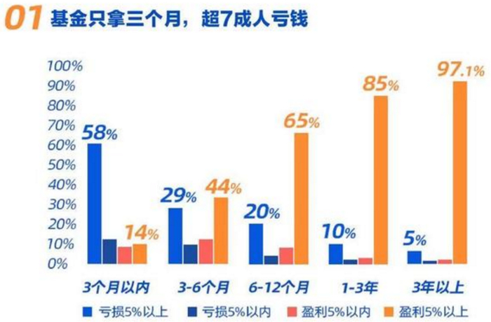 以支付宝金选近一百只产品为例,持有基金时长在3个月以内的用户,超7成都是亏损的;而持有基金时长超过一年的用户中,近9成是赚钱的。此外,如下图所示,随着持仓时间越来越长,盈利5%以上的客户占比不断提升,由14%提升至97%。