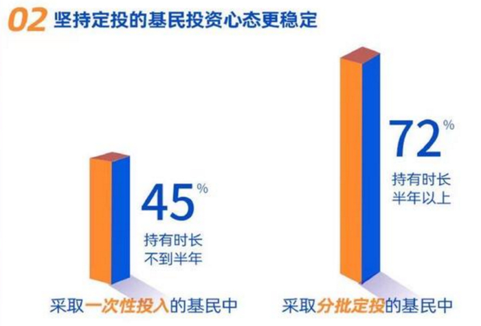因为基金定投是纪律投资,因为将资金分成了很多份,淡化了择时的重要性,在市场回调时也能因为“手握现金流”而更加淡定。根据报告数据,采取一次性投入的基民中,45%持有时长不到半年;而采取分批定投的基民中,72%持有时长在半年以上。