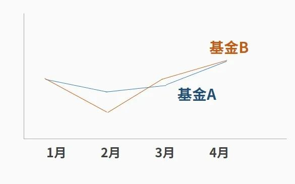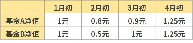 当然,也不是所有的基金都适合定投。对于普通投资者来说,选择波动大的主动偏股或指数型基金,更容易提高收益,因为在净值的大幅波动中反而能够更好的降低投资成本。听上去是不是有点抽象?那我们来举个例子。假设有两只基金 --- 基金A和基金B,净值表现如下。很明显,基金B更加“大涨大跌”一些,波动更大。让我们来看看,如果分别定投基金A和基金B,收益结果有什么不一样。