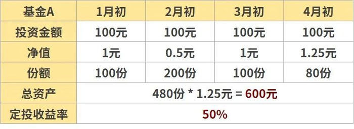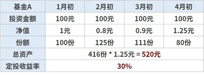 可以发现,如果每月定投基金A,4月初时将获得416份基金A,总资产将升至520元,收益率30%。