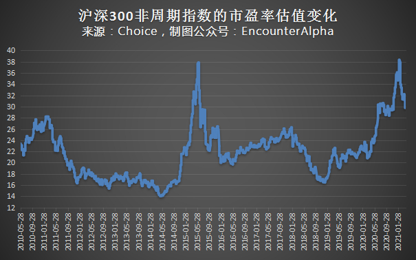 2019年1月初,沪深300非周期指数的市盈率估值为16.45倍,2021年2月10日的市盈率估值为38.33倍,这一数值甚至略高于2015年6月12日的37.85倍。从2019年1月至今,沪深300非周期指数的市盈率变化毫无疑问是牛市形态的,图中三段干拔估值的行情让人印象深刻。三次干拔估值后,市场都有调整然后继续保持健康运行,不知本轮会如何演绎。