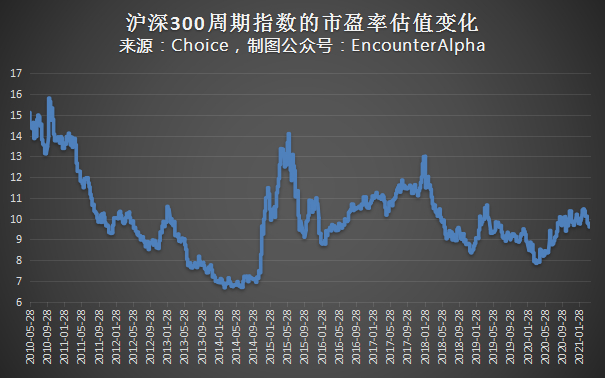 金融地产等行业的滞涨是我们能感受到的,这部分行业因为估值弹性弱化,在一定程度上让沪深300指数的市盈率估值不再夸张。可是,当我们再来看看沪深300非周期指数的估值变化,我们就不难理解核心资产类的公司为什么在过去两年有如此之大的涨幅了。沪深300非周期指数具有更大的指数弹性,未来引入沪深300非周期指数的估值,或许对我们的投资能多提供一重参考。
