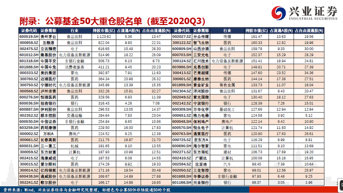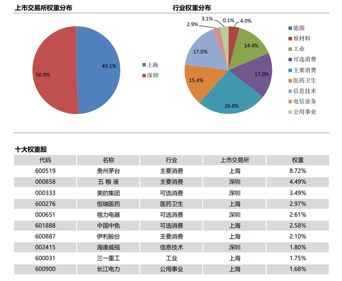 沪深300非周期指数包含了185个成分股,该指数在行业分布与我们熟知的部分主动型基金有相近之处。主要消费、可选消费、医药卫生、信息技术四个行业的权重加总占沪深300非周期指数的75.4%。从前十大权重股来看,两个高端白酒,两个白电龙头,再加上恒瑞、中免、海康、伊利、三一,这前十大权重股符合我们对抱团资产的印象。