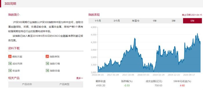 沪深300周期指数包含了115个成分股,金融地产行业占比76%,其他周期性较强的工业、原材料、能源以及一丢丢可选消费行业占据了剩下的24%权重。