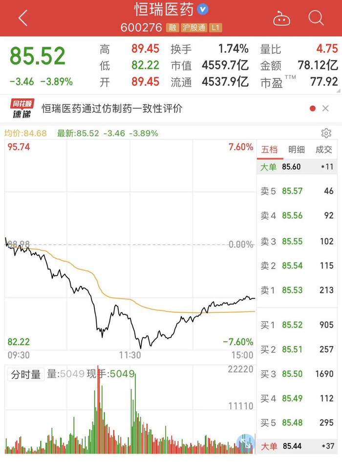 今日开盘,恒瑞医药股价下行,到了10点左右,恒瑞医药股价突然闪崩,上午收盘前,盘中一度跌至82.9元/股,跌幅近7%。下午开盘后,恒瑞医药股价再次跳水,最低跌至82.22元/股,跌幅达7.6%,随后股价逐渐拉高,最终报85.52元/股收盘,跌3.89%。