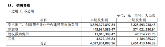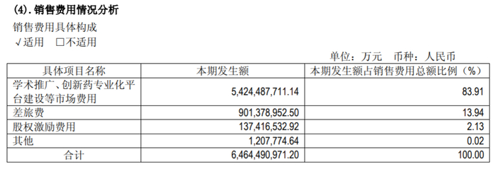 而在2019年财报中,销售费用依旧高居不下,学术推广等市场费用增长至75亿元,差旅费依旧为9亿元。
